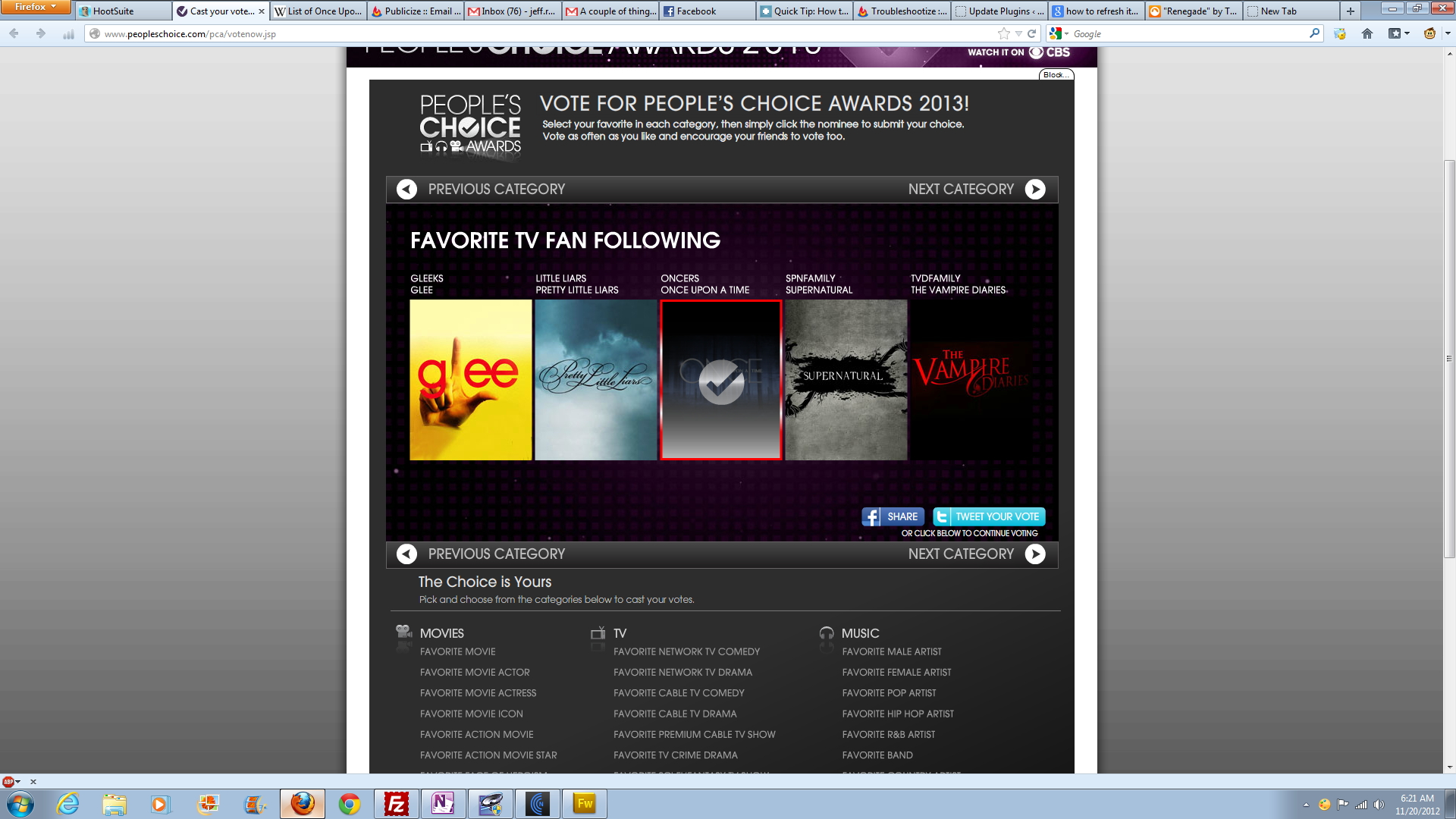 One of us, or many of us can set aside a section of time and Tweet out “Hey #Oncers, PCA Voting for OUAT with me at ow.ly/fnfuC for 30 mins RT & Vote Often!! Go!!” (or whatever time you’ve got to vote) This is a variation of the single category voting reminders, but I like the calling together (like Jane does) to vote as a shared experience.